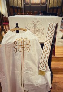 In my role on Altar Guild, Jon told me about his and Michael’s gift to the congregation—custom new vestments. I was under strict orders to keep this secret and under wraps. But, unbeknownst to Jon, I contacted the fabric artist they commissioned. I asked if there was anything she might have added to the order to enhance her vision of the art that she would be creating. Indeed, she did have ideas! First of all, she wanted to complete an artistic element on Jon’s chasuble (robe) that she felt completed her design. Next, she thought it would enhance the chancel if we had a matching pulpit hanging.